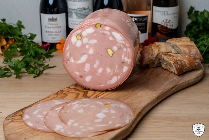 La mortadelle est une saucisse italienne douce, souvent parsemée de pistaches, idéale pour les sandwiches ou les apéritifs.