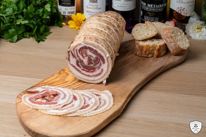 La pancetta, une charcuterie italienne au goût légèrement salé, est idéale pour les plats cuisinés ou dégustée en tranches fines.